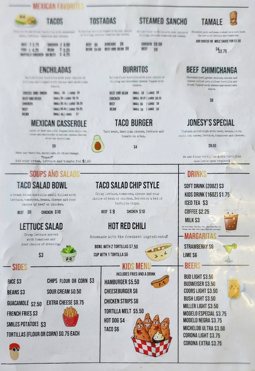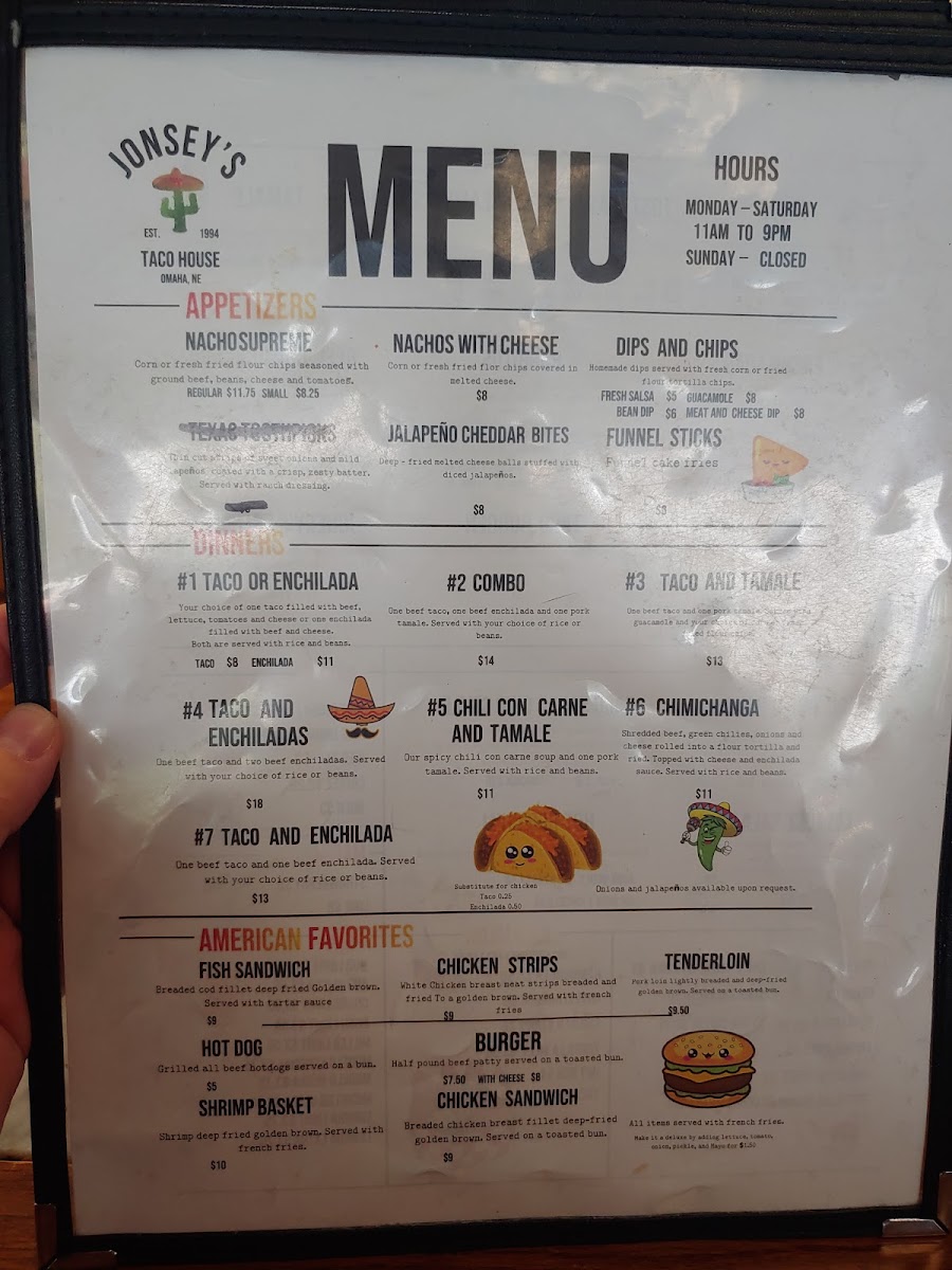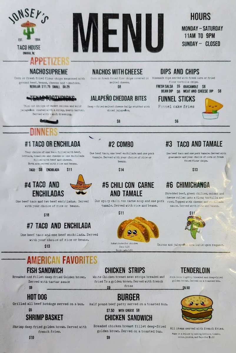 Welcome to Jonesy's Taco House, a hidden gem located at 1502 S 60th St, Omaha, NE. This cozy eatery offers a delightful mix of American favorites and authentic Mexican flavors. With signature dishes like the Single Cheeseburger and Double Cheeseburger Deluxe, there's no shortage of comfort food. But it's the tacos that shine—packed with flavor, and complemented by homemade sides like Spanish rice and seasoned refried beans.